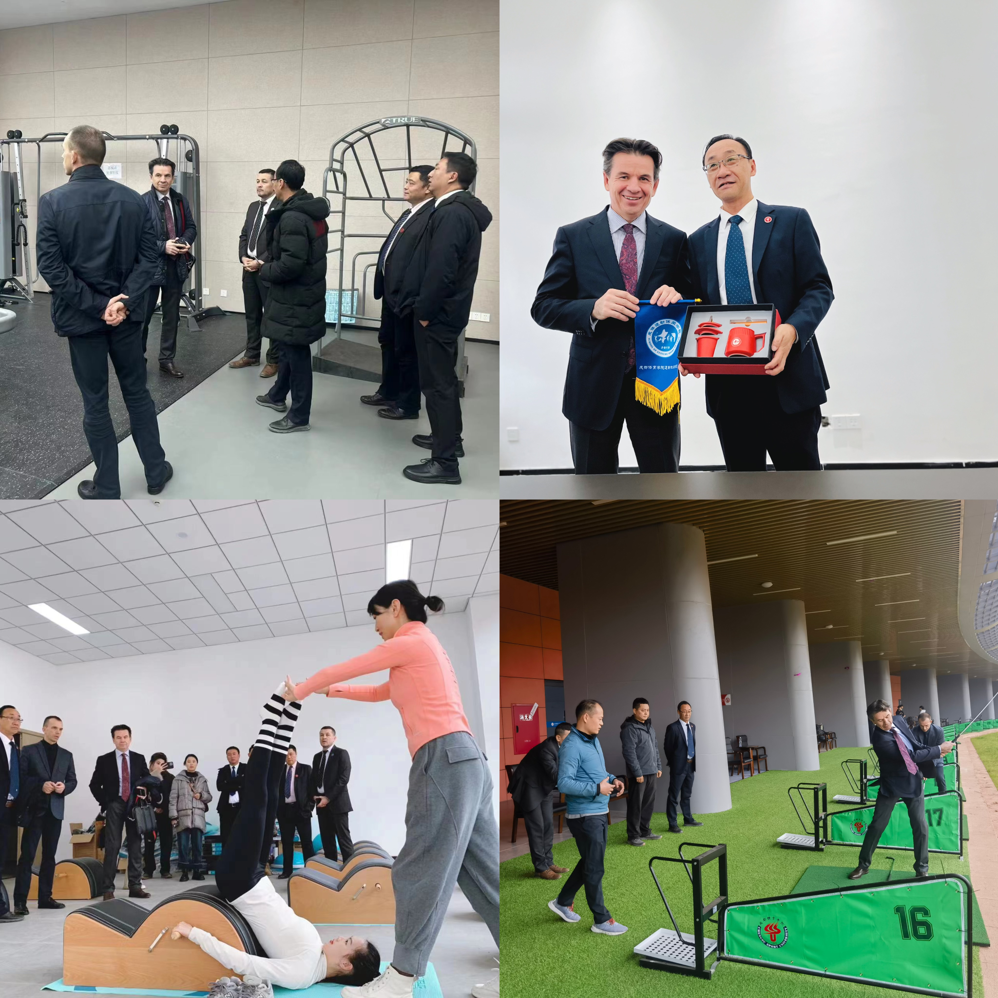 交流团一行分别参观了学校运动休闲馆和攀岩馆,饶有兴趣地进行了高尔夫运动体验,观摩了高尔夫运动、瑜伽、普拉提等课程教学。
