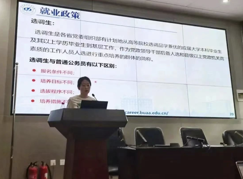 为了帮助大家更好的明晰就业市场变迁,了解自身就业优势,进一步明确求职意向,邀请学院老师和毕业生为同学讲解毕业去向、进行就业指导。